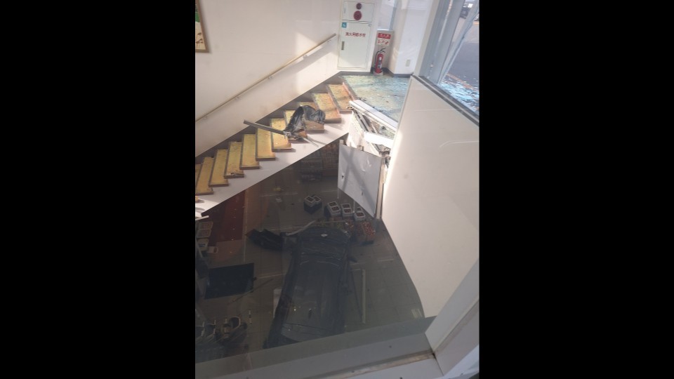 関係者によりますと、屋上の店舗出入口から車が進入し、階段をつたって1階に転落したということです。視聴者提供