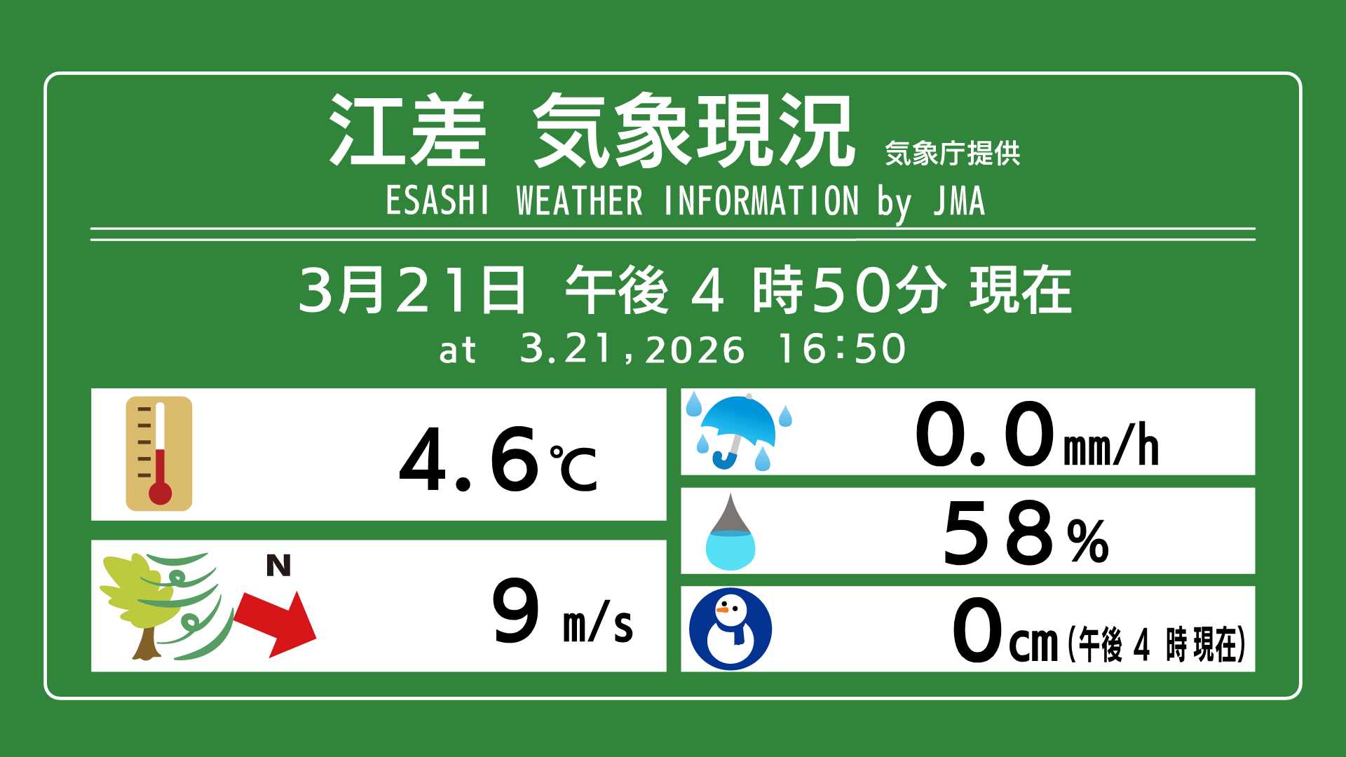 HBC情報カメラ・いまの江差 江差町の情報カメラは、江差港を見下ろす海抜31mの高台にあります。江差町は江戸時代のニシン漁最盛期には「江差の五月は江戸にもない」といわれるほど繁栄しました。中歌、姥神町一帯の旧国道沿い地区の“いにしえ街道”には、ニシン取引に関連した問屋、蔵、商家などの歴史的建造物が残され、北前船交易によりもたらされた伝統芸能や、生活文化も数多く伝承されています。港には奥尻島と結ぶフェリーのターミナルもあり、1日1~2往復運航していている様子も見られます。 <いまの気象現況> 北海道のこんなところにあります