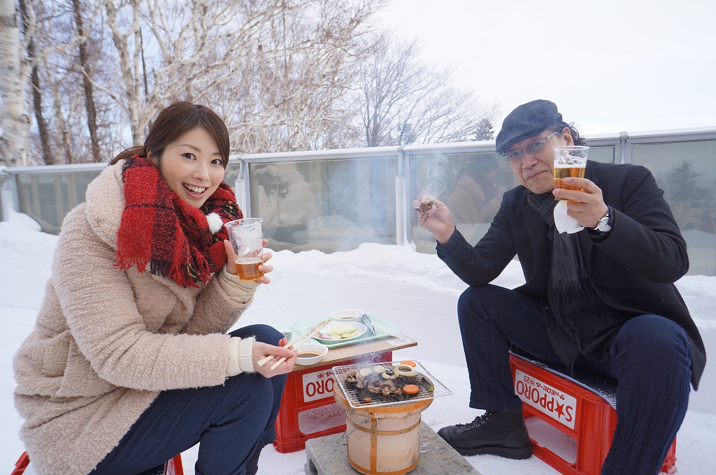 The coast in Atsuma is a mecca for Hokkaido's surfers. Rui and Aya enjoy sake on the coast, using a surfboard as their table! Next, they try a very popular pork bowl dish. The bowl, the rice, the pork... even the charcoal used to cook it are all locally sourced. This dish, with its three different types of meaty texture, goes wonderfully with beer. Next, Rui is intrigued by the region's haskap berry. A coffee house in the forest sells hand-baked cookies and roll cakes so good people come all the way from Tokyo to try them. And as Rui and Aya enjoy Grilled Mutton Dish at a campground under the blue sky, it's time for another beer! |