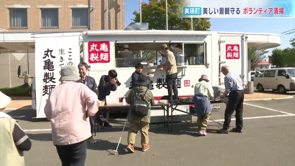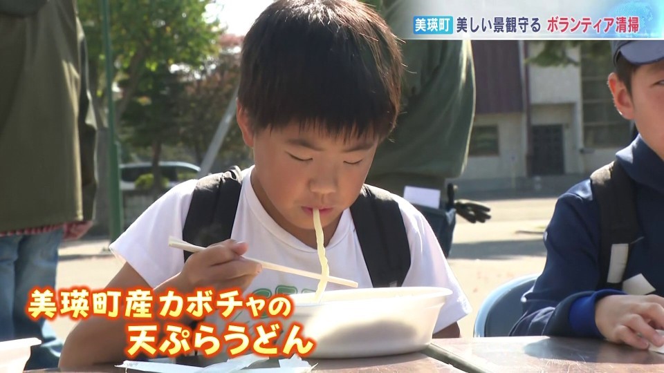 清掃のあとには「丸亀製麺」を展開するトリドールホールディングスが、美瑛町産のかぼちゃを使った天ぷらうどんを振舞い、参加者らが、疲れを癒していました。
