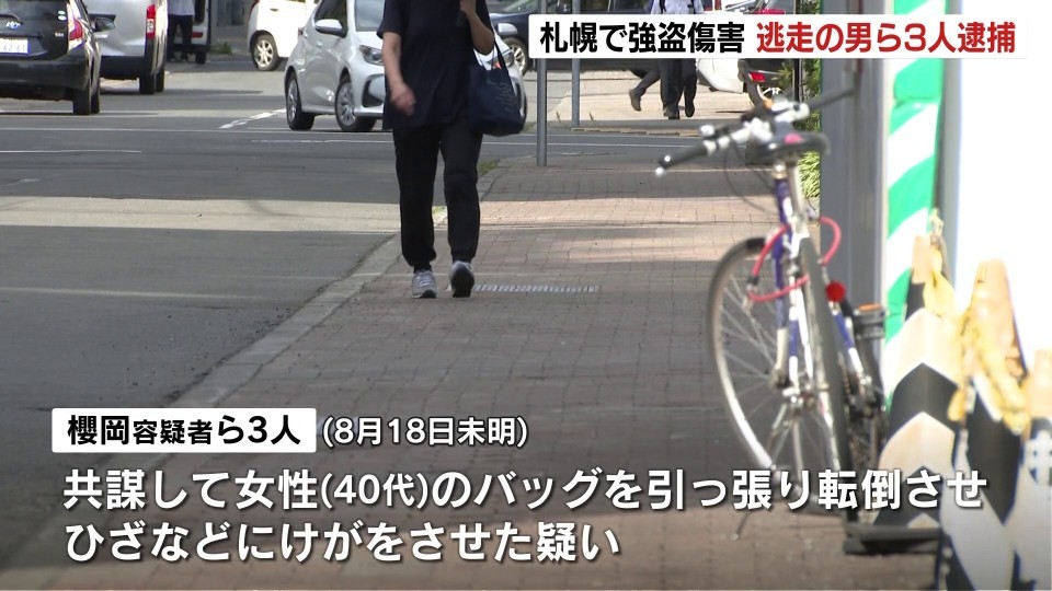 3人は共謀し、8月18日未明に、札幌市中央区の路上で帰宅途中だった40代女性の後ろから自転車で近づきバッグを引っ張って転倒させてひざなどにけがをさせた疑いが持たれています。