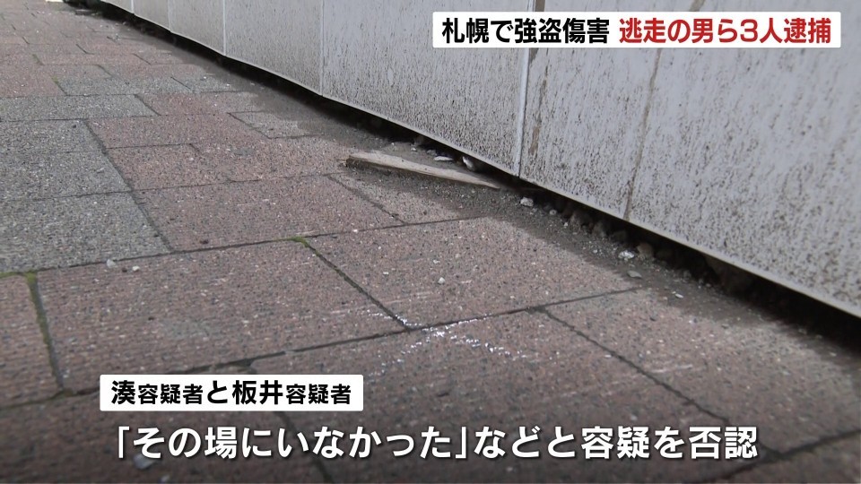 強盗傷害の疑いで逮捕されたのは、札幌市の櫻岡孝公容疑者42歳と湊真誉容疑者44歳、板井輝智雄容疑者39歳です。