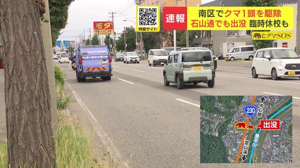 「交通量のとても多い石山通り沿いです。きょう午前2時すぎタクシーの運転手が道路上にいたクマに威嚇されたということです」
