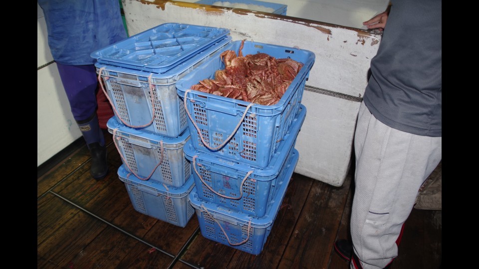 当時、立ち入り検査をしていた海上保安庁の職員が、船内で毛ガニが入った箱を発見。第八仁宝丸(提供・函館海上保安部)