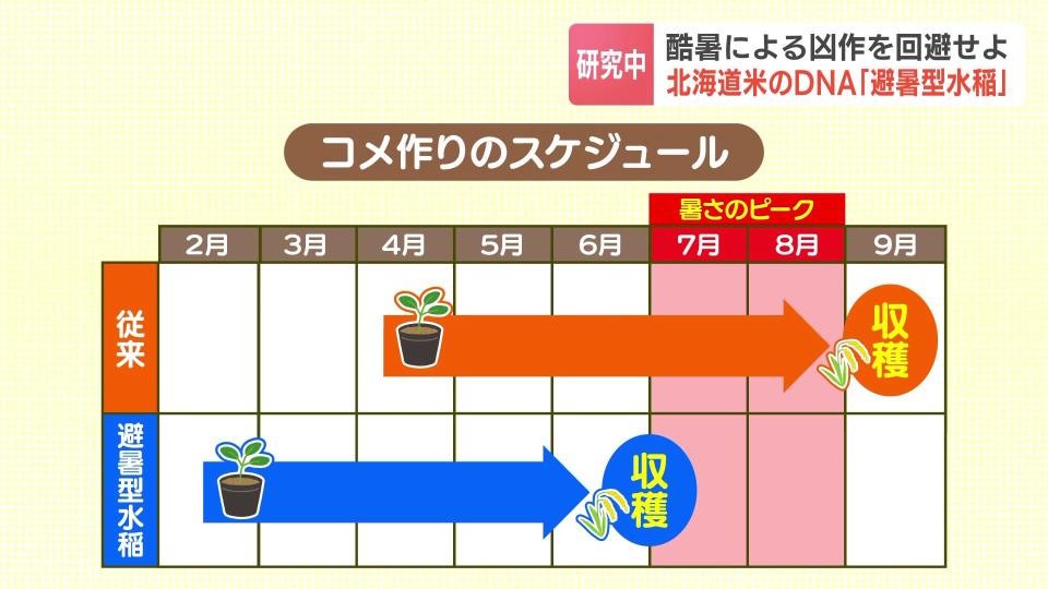 一方、研究チームが提案する「避暑型水稲」は、一連のコメ作りの行程を2か月ほど前倒しすることで暑さがピークを迎える7月、8月を前に収穫をしてしまいます。