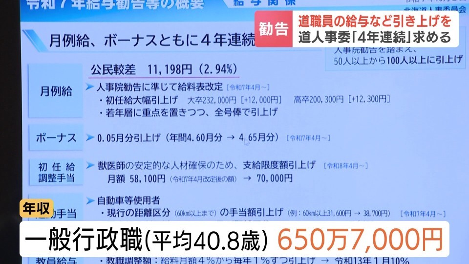 北海道職員の給与 4年連続で引き上げるよう鈴木知事に勧告 平均月給1万1196円アップ求める 実施されれば一般行政職(平均40.8歳)の年収650万円へ