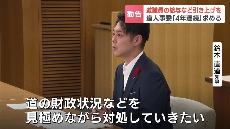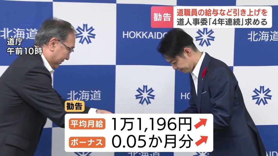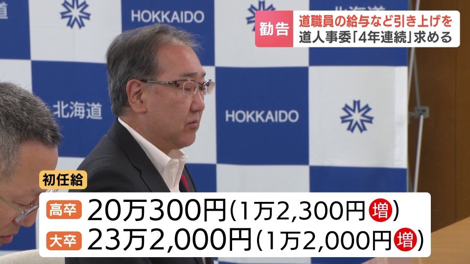 北海道の人事委員会は、北海道職員の給与が民間の水準を下回っているとして、4年連続で引き上げるよう鈴木知事に勧告しました。