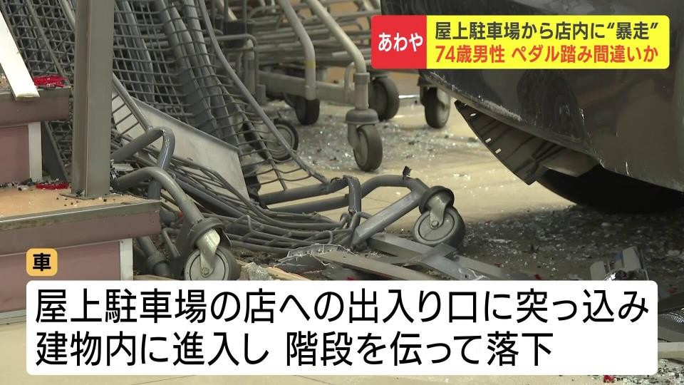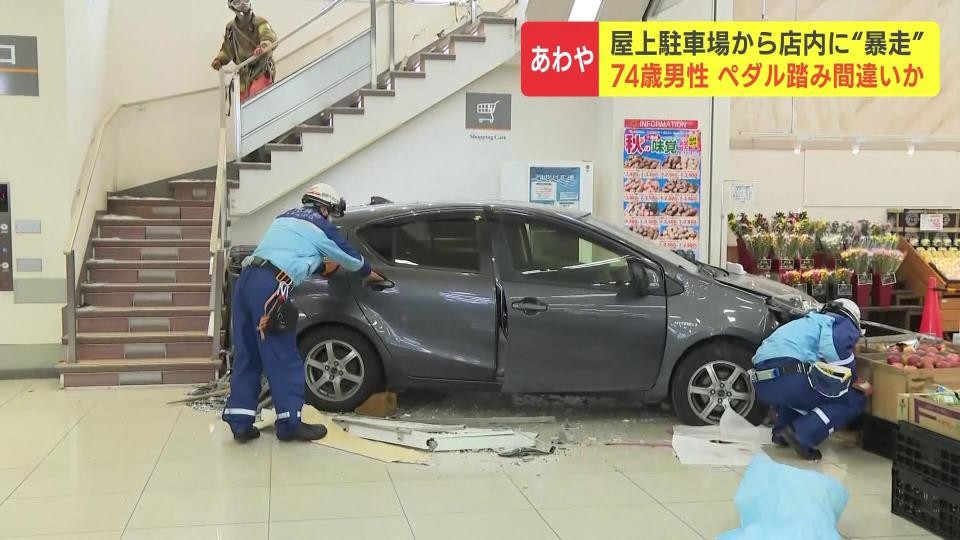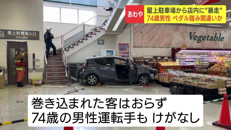 スーパーの運営会社によりますと、車は屋上駐車場にある店への出入口に突っ込み、そのまま建物内に進入、階段を伝って落ちて来て、1階の野菜売り場でようやく停車したということです。