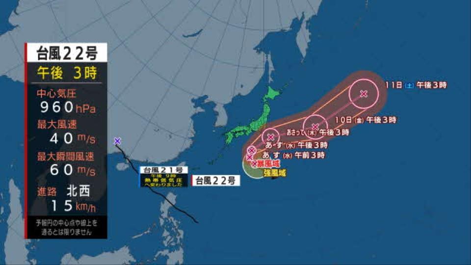 台風第22号は日本の南海上にあり、中心気圧は960ヘクトパスカル、中心付近の最大風速は40メートル、最大瞬間風速は60メートルとなっています。