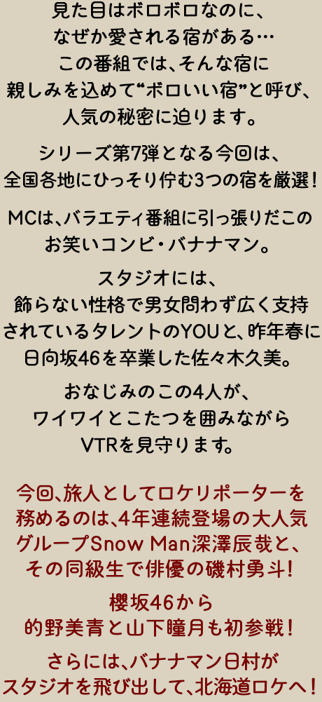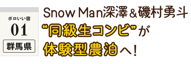 Snow Man深澤辰哉と俳優・磯村勇斗の“同級生コンビ”は、群馬県沼田市で広大な棚田を見下ろす農泊へ。剥がれ落ちた土壁や、なぜか2階の窓にある謎の玄関扉……。『ボロ宿』ロケ常連の深澤ですら不安を隠せない様子!?しかし、地元でも評判の仲良し夫婦に温かく迎えられ、りんご園でもぎたてを丸かじりしたり、奥様特製のスイーツを堪能したりと、心温まるおもてなしで交流を深めていく。夕食では、二人が料理に挑戦!普段から自炊をするという磯村の腕前はいかに?さらに、日が暮れた宿の周りを幻想的に彩る「灯り」の正体とは……。気心知れた仲良しコンビならではの、和気あいあいとした空気感にも注目を!