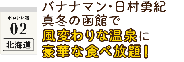 MCのバナナマン日村勇紀は、函館空港から車でわずか10分の「ボロいい宿」へ。“宿”と書かれた看板を発見し近づいてみるものの、古びた食事処のような佇まいに戸惑う日村…。出迎えてくれたのは女将である長女と次女・三女とそのお母さん。そこは家族で営むという民宿だった!早速、4人の案内で近郊のおすすめスポットへ。一面に広がる氷の世界で、ワカサギ釣りを体験!そして、冷えた体を温めてくれたのは全国的にも珍しい露天風呂!冬の函館を満喫して宿に戻り、お待ちかねの夕食は港町函館ならではの、旬の味覚がなんと食べ放題!多くのお客さんを魅了してきたそのメニューとは?