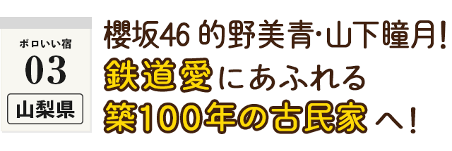 『ボロ宿』ロケ初挑戦の櫻坂46・的野美青と山下瞳月が訪れたのは、山梨県都留市。富士急行線・谷村町駅から徒歩30秒という好立地に佇む、築100年の古民家へ。館内には至る所に鉄道グッズが並び、子ども連れの家族にも大人気だというお部屋には「あっと驚く仕掛け」が!?また、近くの道の駅では地元名物グルメを堪能。山下渾身の食レポは必見!夕食作りでは、二人がご主人のお手伝いに挑戦。海の幸と野菜がたっぷり入った山梨名物の郷土料理にも注目です。