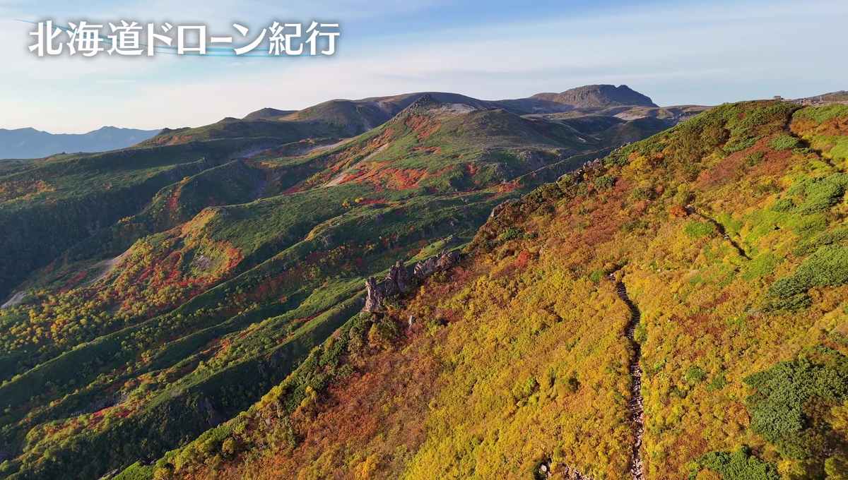 〝日本一早い紅葉〟に映える大雪山の山々。9月12〜13日、旭岳から黒岳への縦走でのドローンフライト。ナナカマドなどの赤が、ハイマツの緑と、美しい対比を見せる。黒岳では9月21日、去年より1日遅い〝初冠雪〟が確認された。美しい紅葉は、次第に麓へと広がり、北海道は秋色に包まれる。