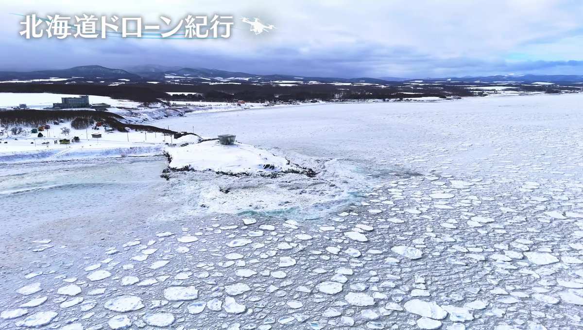 2025年2月11日、流氷接岸初日の「日の出岬」。アムール川から約1,000kmの旅をしてたどりり着いた氷 。水平線までびっしりと海をおおった流氷が、青空に映える。ガラス張りの展望施設「ラ・ルーナ」からの眺望は〝絶景〟長い旅を終えた〝白い海〟は、冬のオホーツクだけの風景。